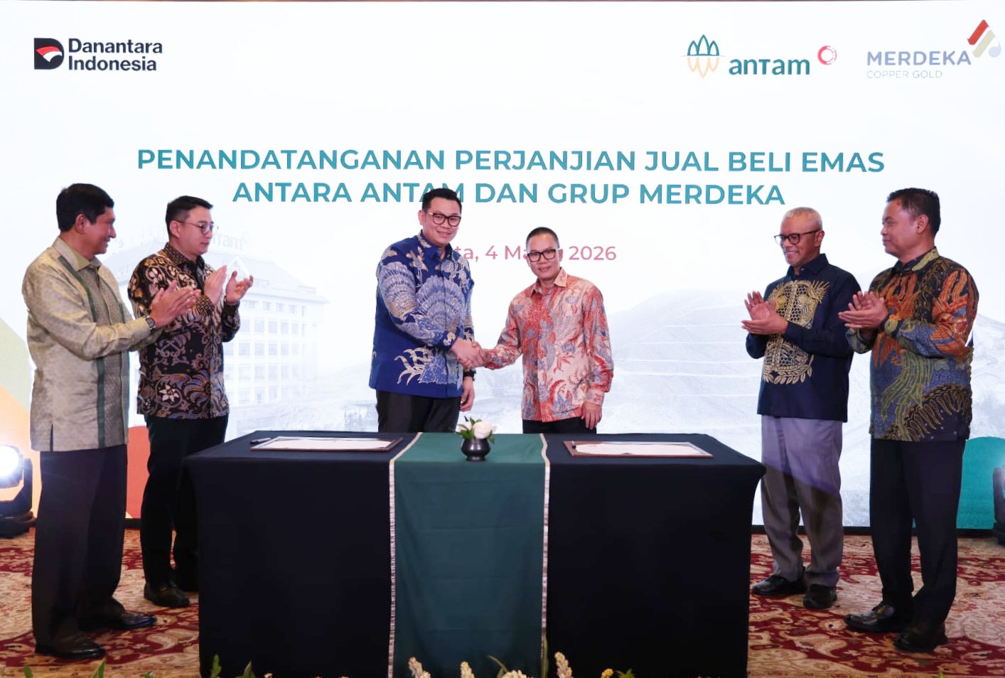 Jakarta, Kabarkansaja.com - Dari kiri ke kanan, Direktur Utama MIND ID Maroef Sjamsoeddin, Presiden Direktur PT Merdeka Copper Gold Tbk Albert Saputro, Direktur Komersial PT Aneka Tambang Tbk (ANTAM) Handi Sutanto, Direktur PT Bumi Suksesindo Riyadi Effendi, Direktur PT Puncak Emas Tani Sejahtera Boyke Poerbaya Abidin, dan Direktur Utama ANTAM Untung Budiharto saat prosesi penandatanganan kerja sama strategis di Jakarta, Rabu (4/3/2026).